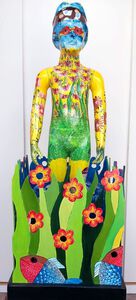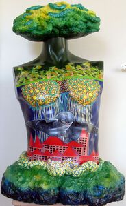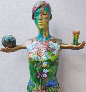 2012De natuur zit in ons, maar materialisme heeft de overhand. Meer zorg voor natuur anders zal zij onverbiddelijk toeslaan. (Acryl op kunststof)
